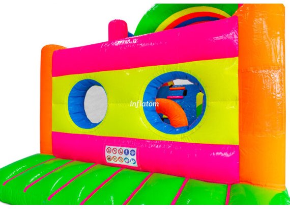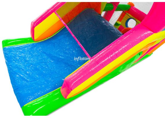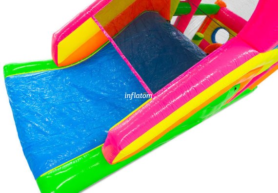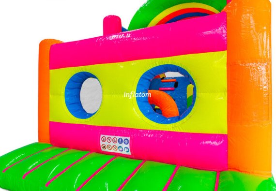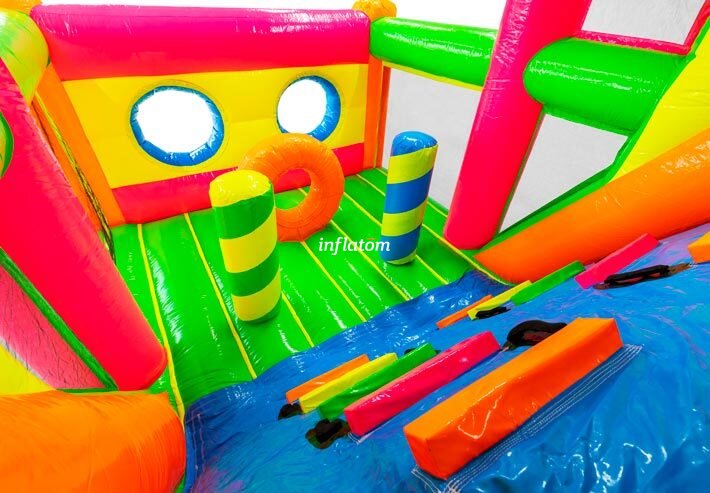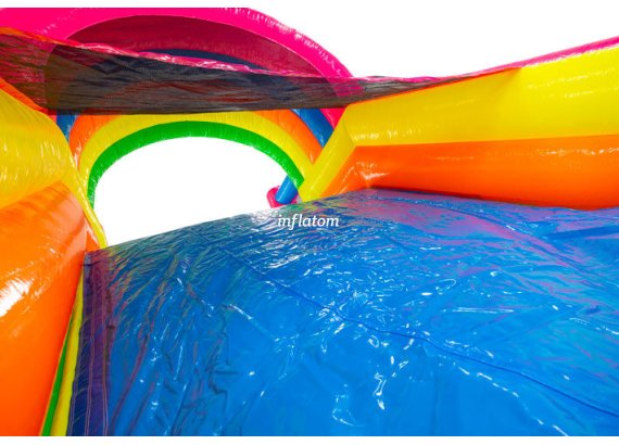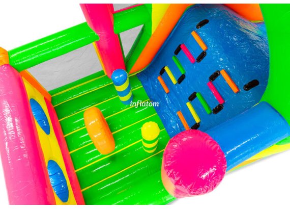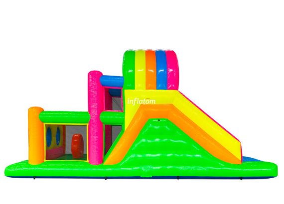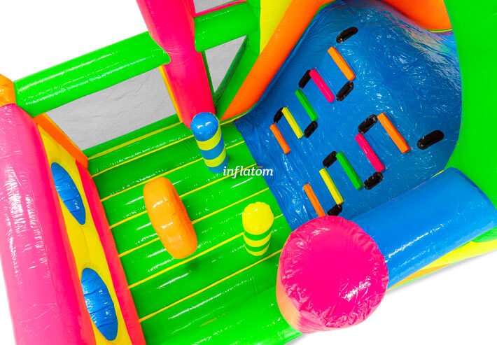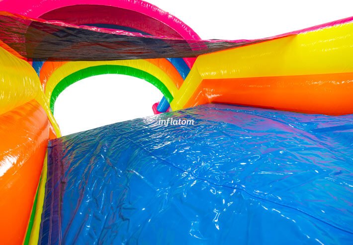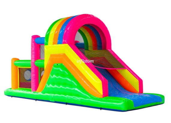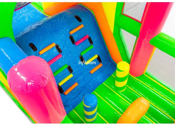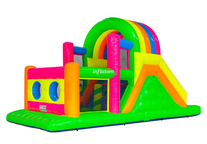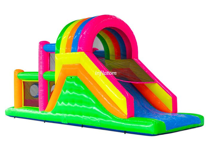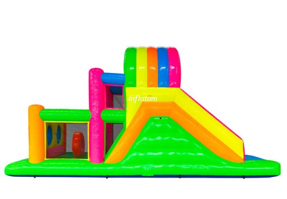 9 m hinderbana med häftiga hinder och rutschkana. Perfekt för lek och tävling för barn och vuxna. Kompakt design med snygga 3D‑detaljer.