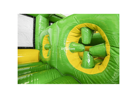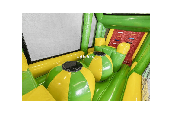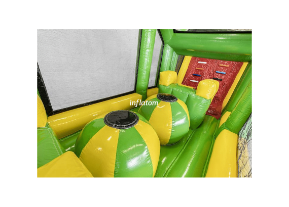 Säkerheten är på topp: hela banan är försedd med nät längs sidorna, så alla kan köra på i full fart utan risk. Det färgstarka och iögonfallande designet gör hinderbanan till en självklar publikmagnet.
