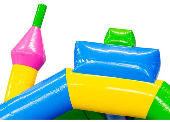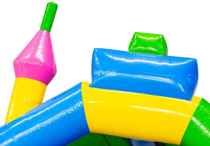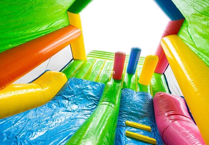 Kombinerad hoppborg och rutschkana med Bif’n Bash samt trappa och rutschkana längst bak.