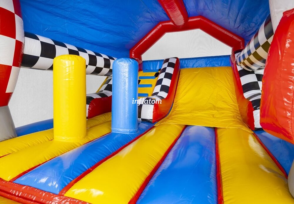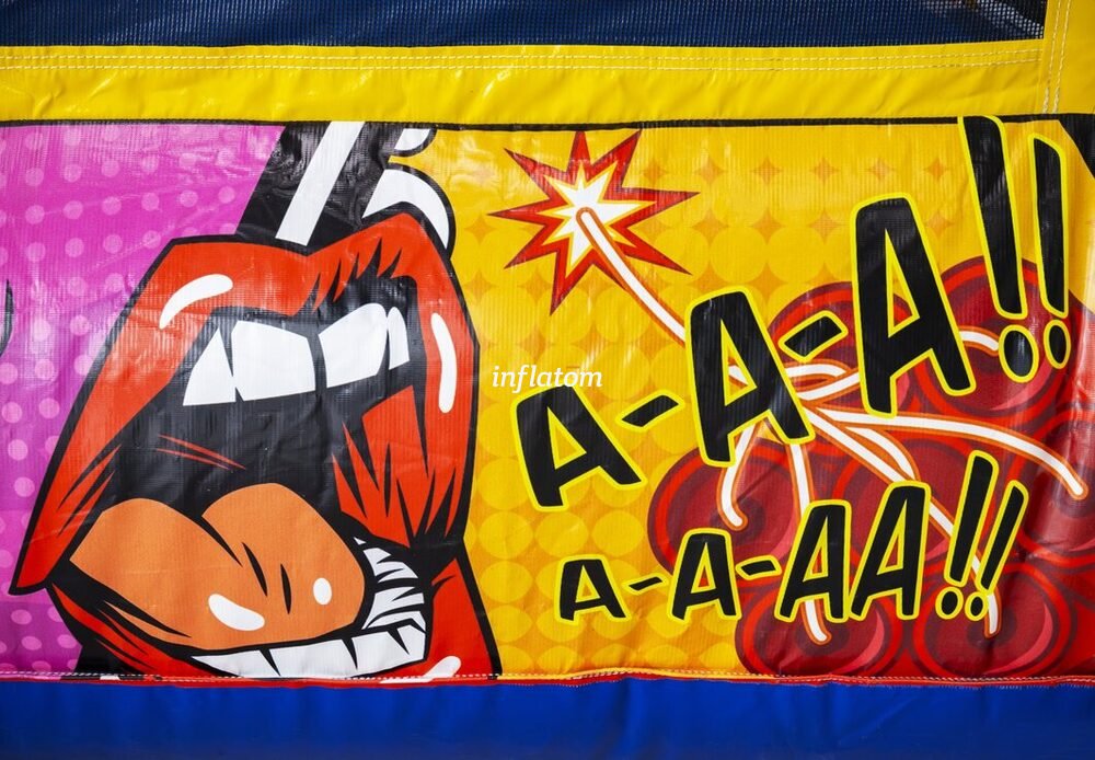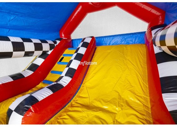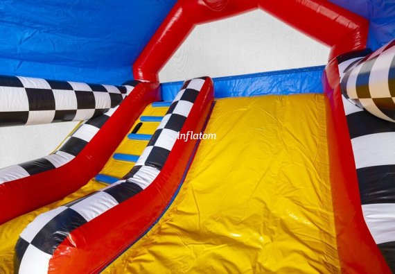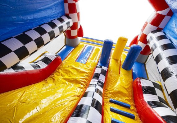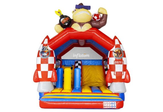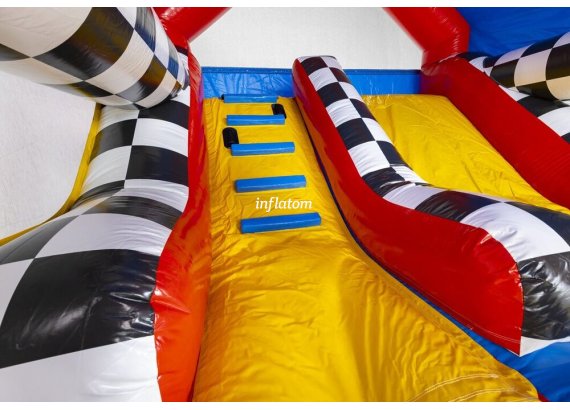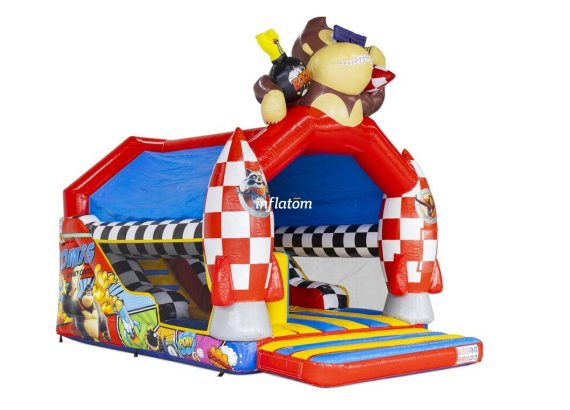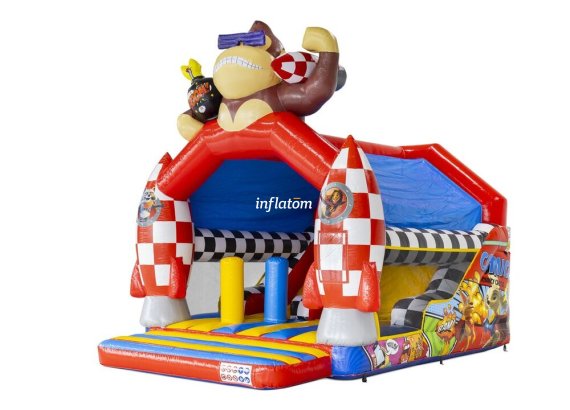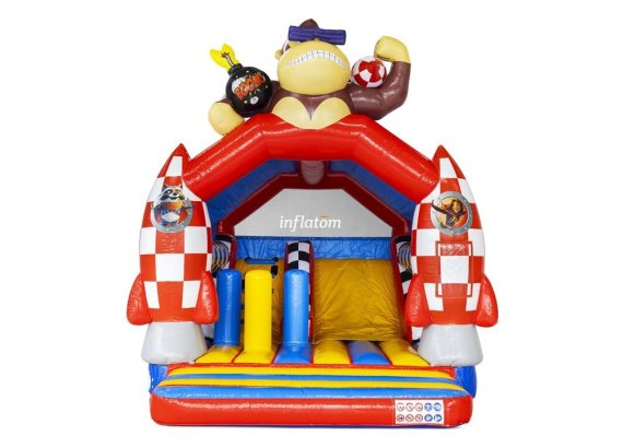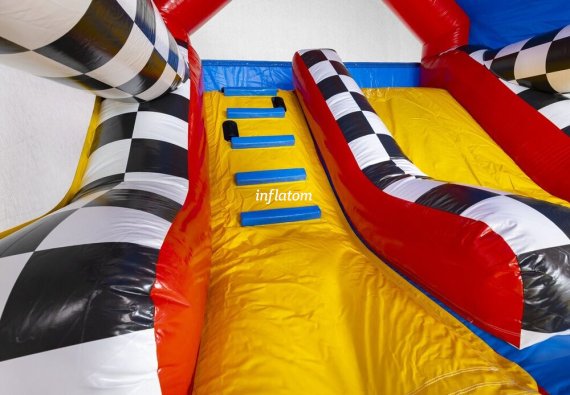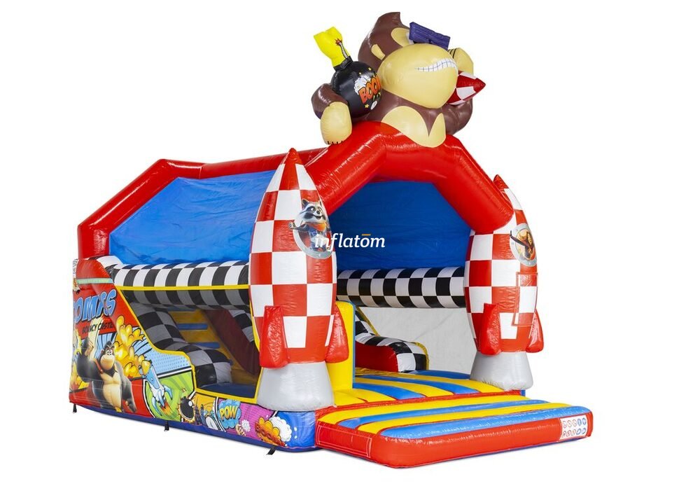 Kombinerad hoppborg och rutschkana med Bif’n Bash samt trappa och rutschkana längst bak.