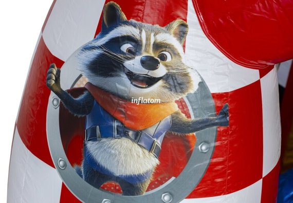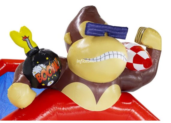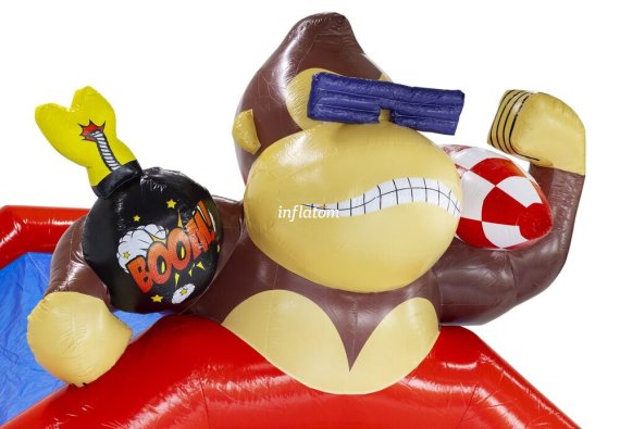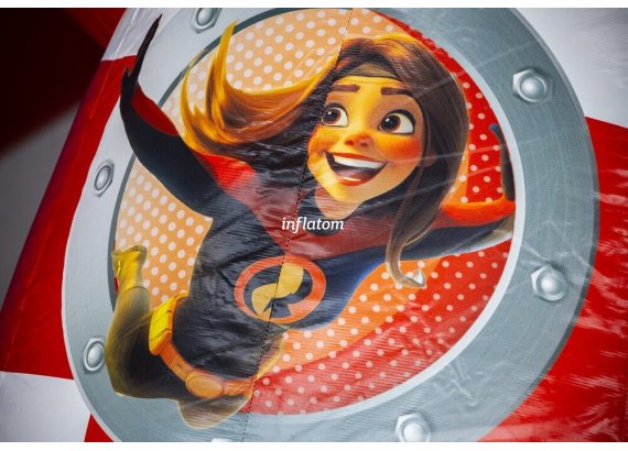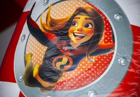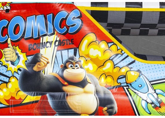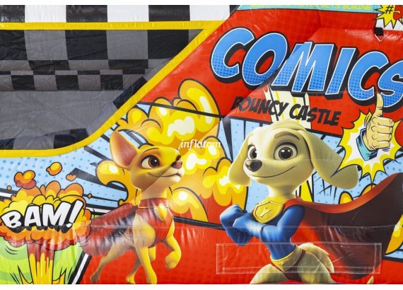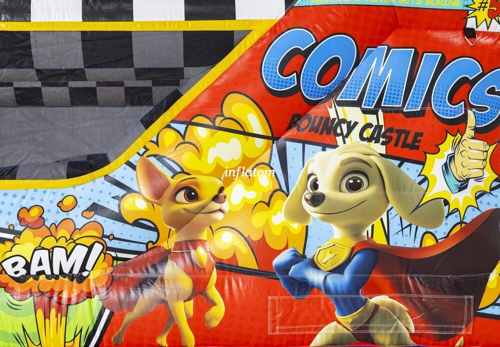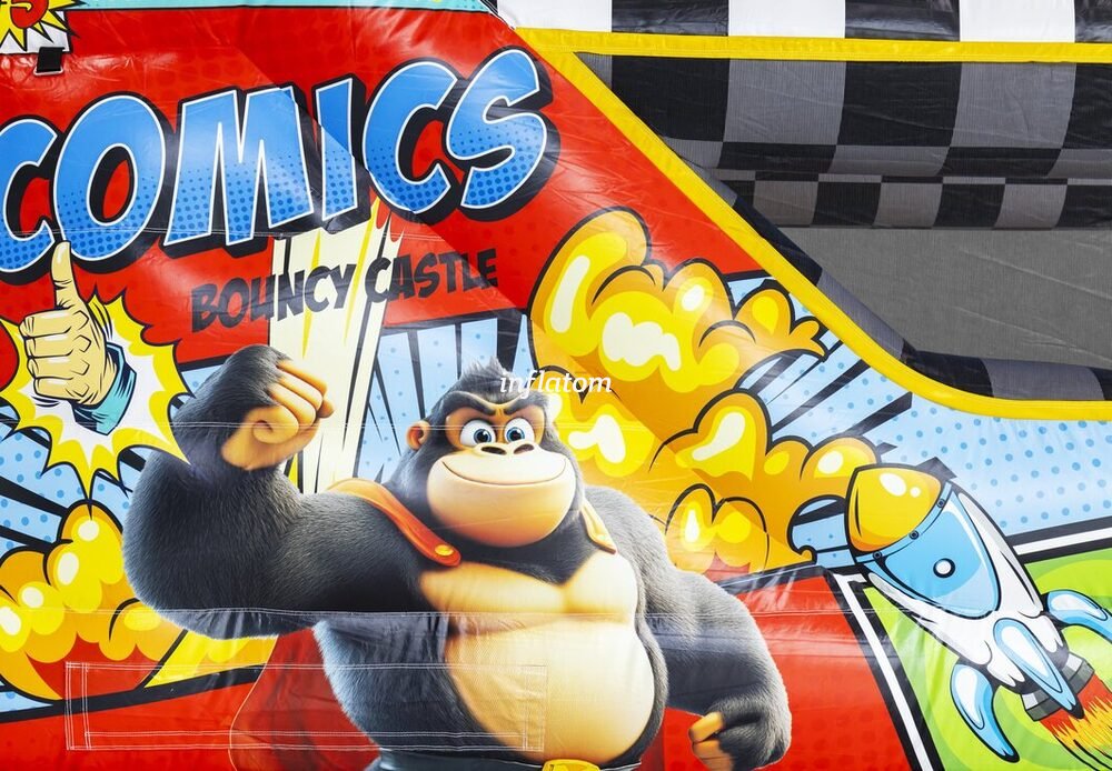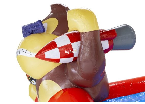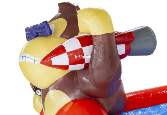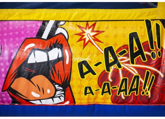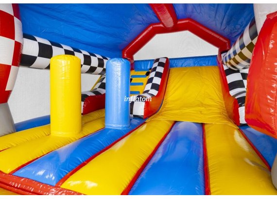 Kombinerad hoppborg och rutschkana med Bif’n Bash samt trappa och rutschkana längst bak.