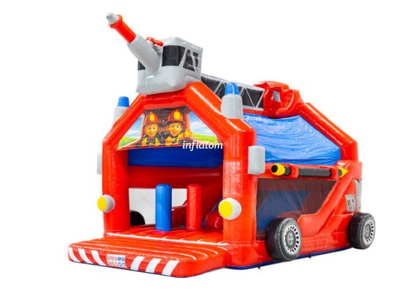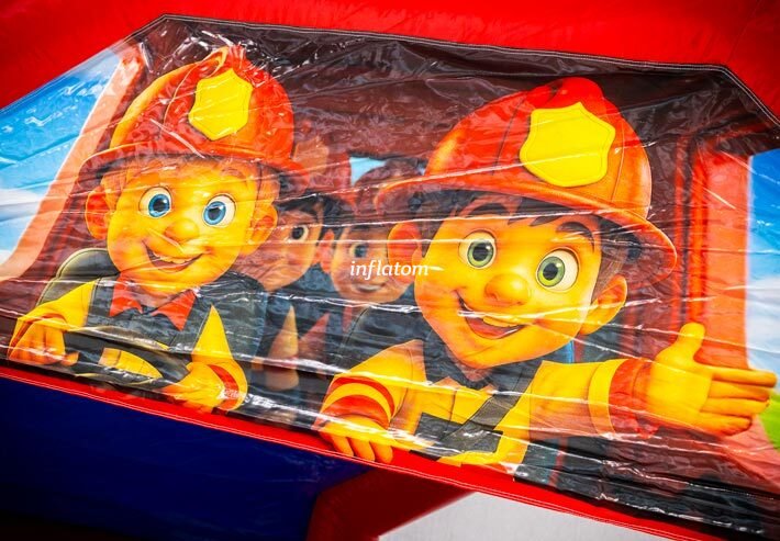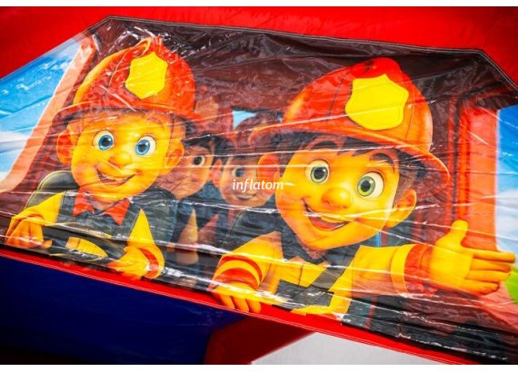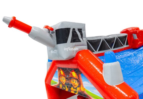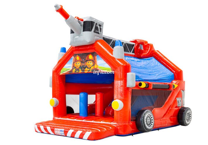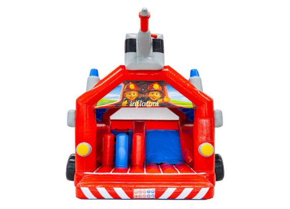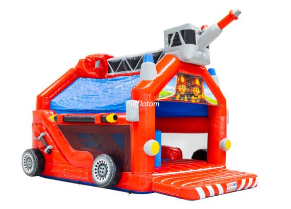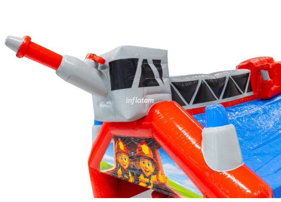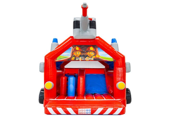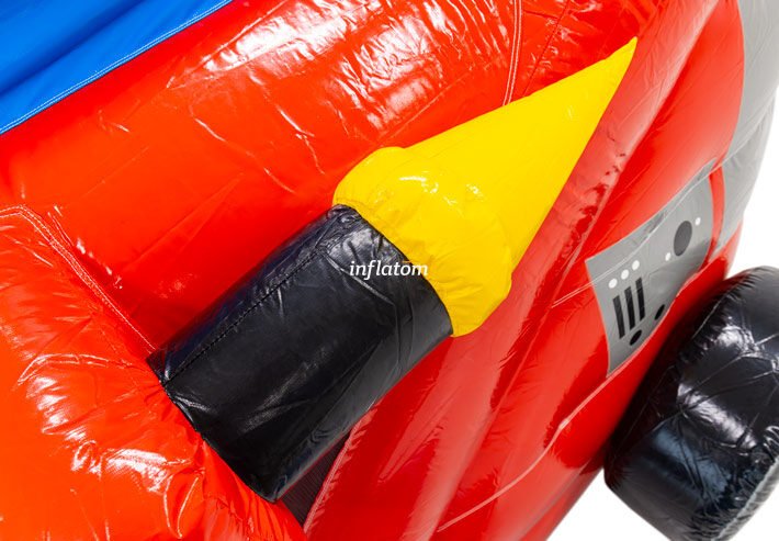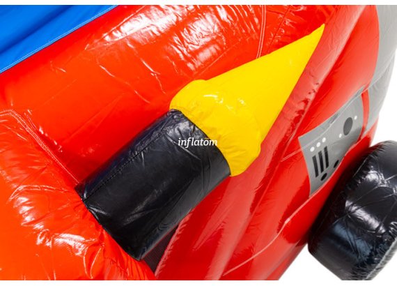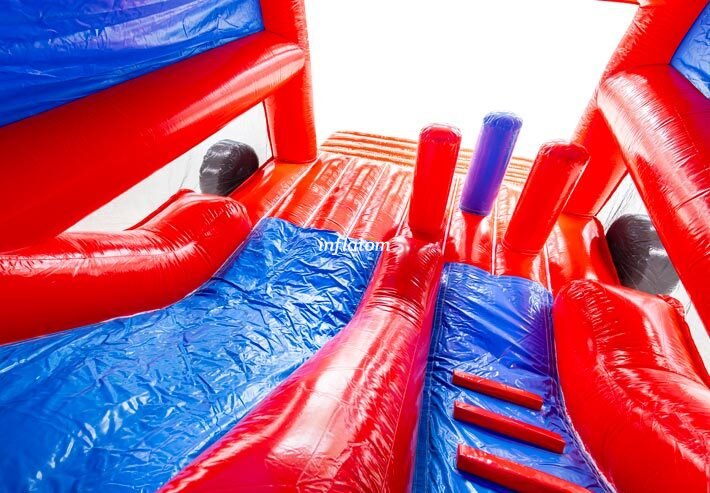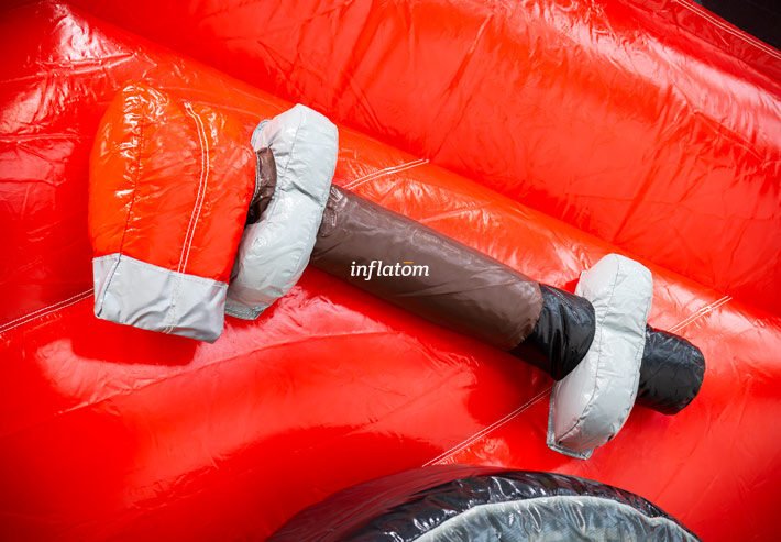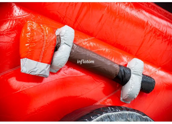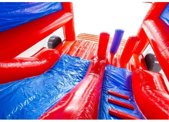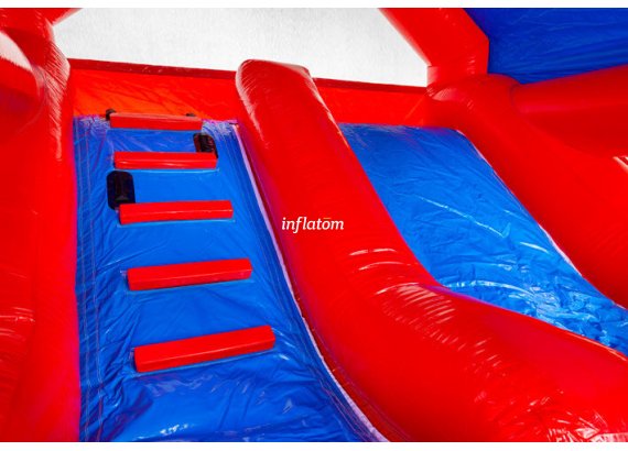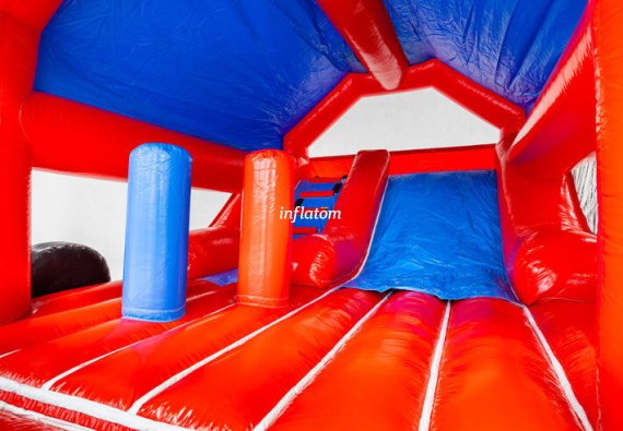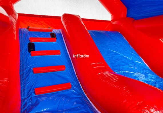 Kombinerad hoppborg och rutschkana med Bif’n Bash samt trappa och rutschkana längst bak.