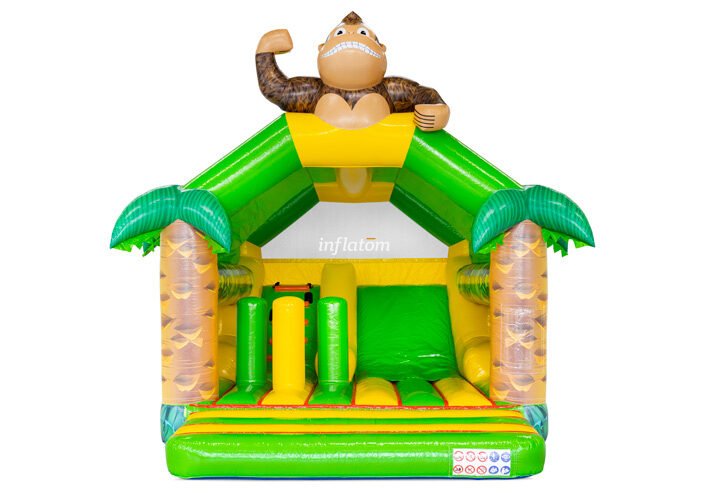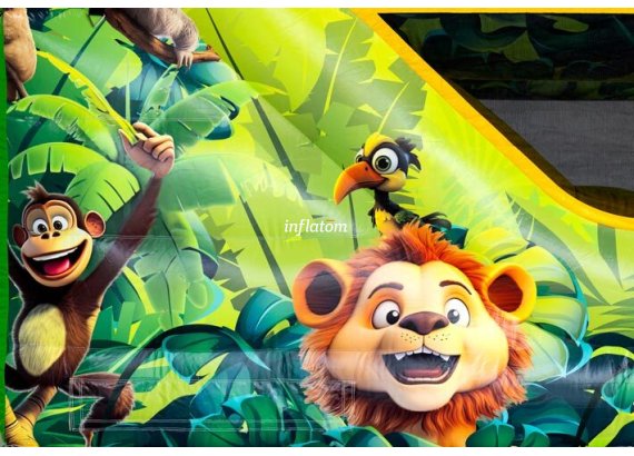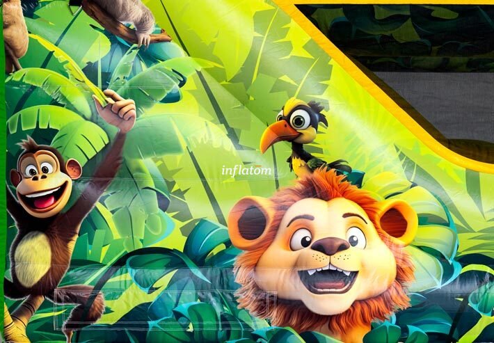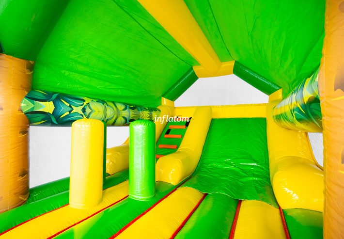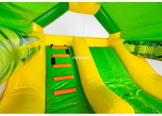 Kombinerad hoppborg och rutschkana med Bif’n Bash samt trappa och rutschkana längst bak.
